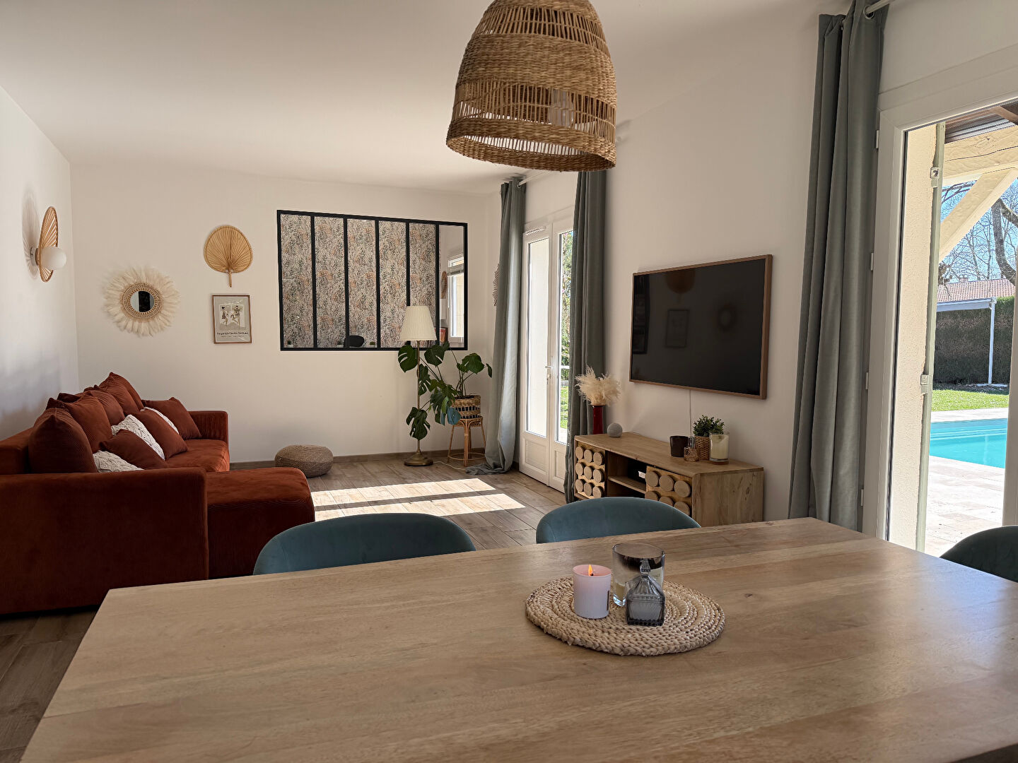 Belle piscine 7,5 X 3,5 chauffée avec pool house et terrasse carrelée, un local technique, une terrasse couverte et un carport permettant d’accueillir 2 voitures et équipé d’une borne de recharge.