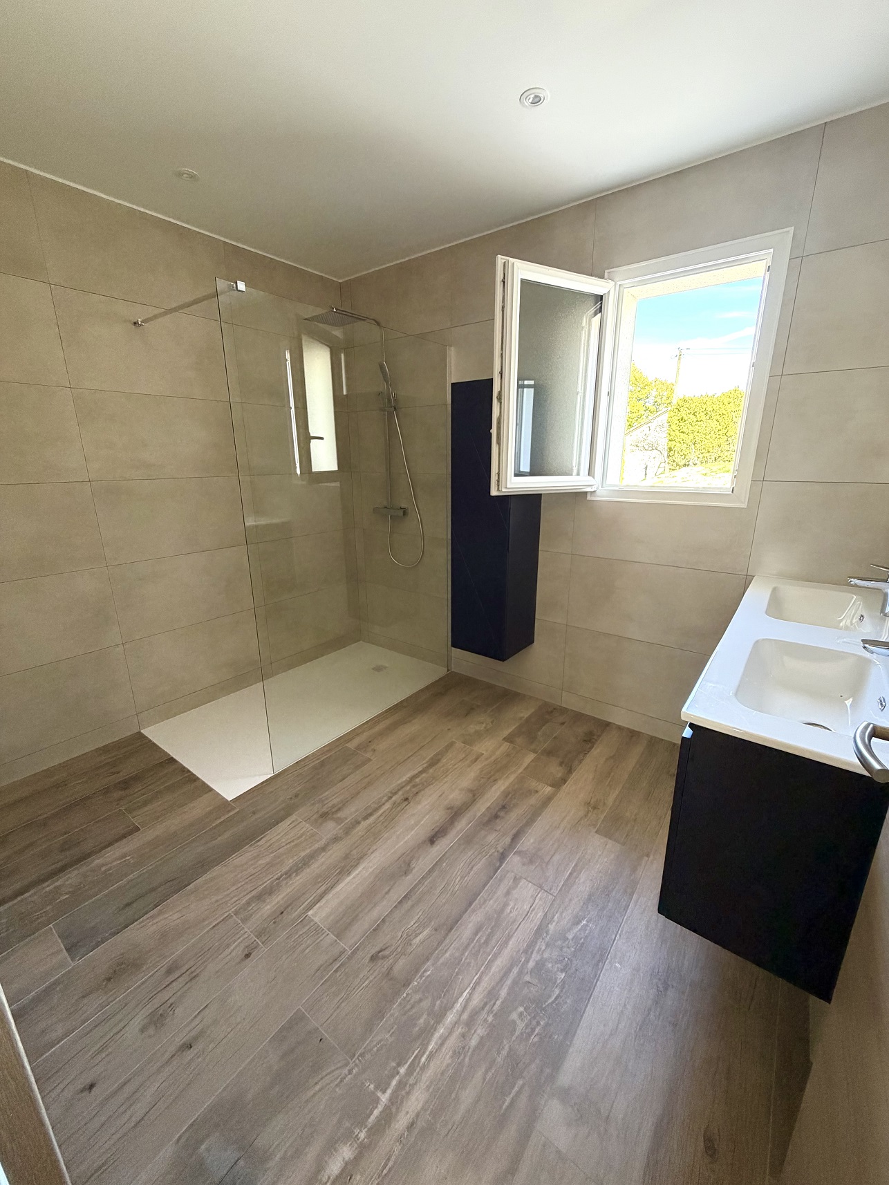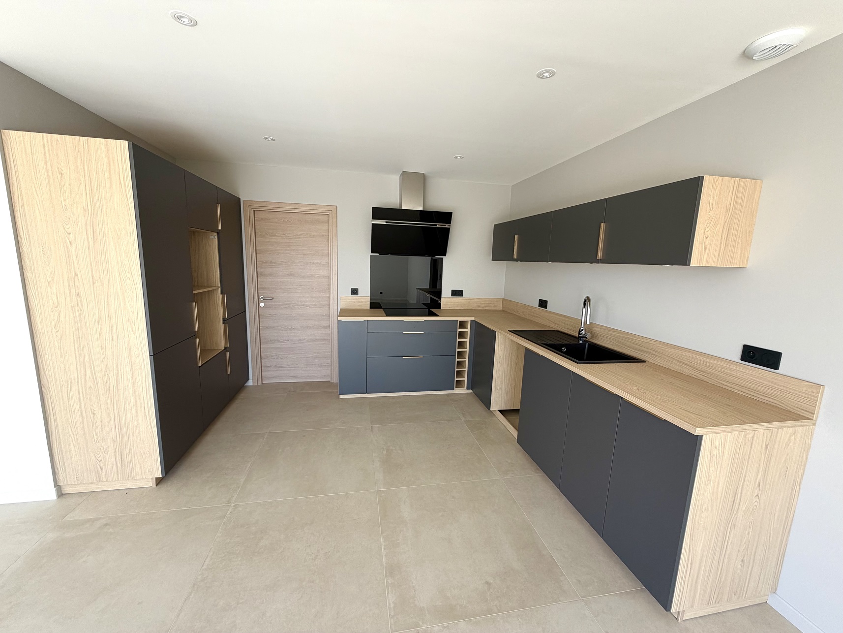 Elle comprend une entrée, une belle pièce de vie climatisée ouvrant sur la terrasse, une cuisine équipée et aménagée, 3 chambres, une salle d’eau, 2 WC, une buanderie/cellier et un garage de 37 m2 avec porte motorisée.
